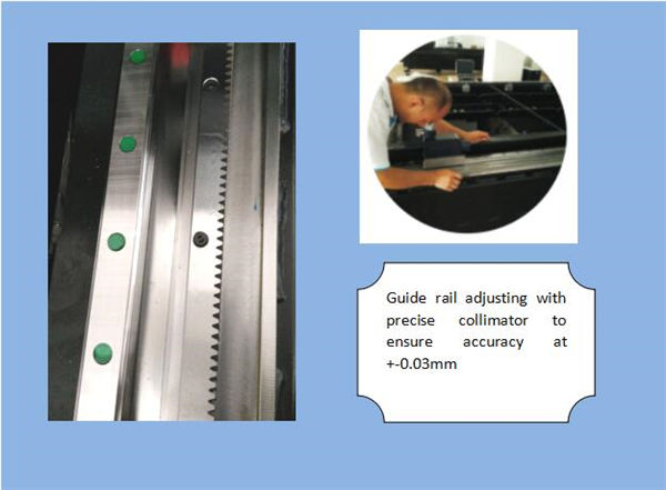 | Име:Прецизни линеарни упатства Напреден систем за сечење, ласерско напојување и серво движење совршено одговараат, увезени систем со погон со голема прецизност и погон на багажници, разменлива двојна работна маса, за да се обезбеди поголема брзина на преработка и точност |