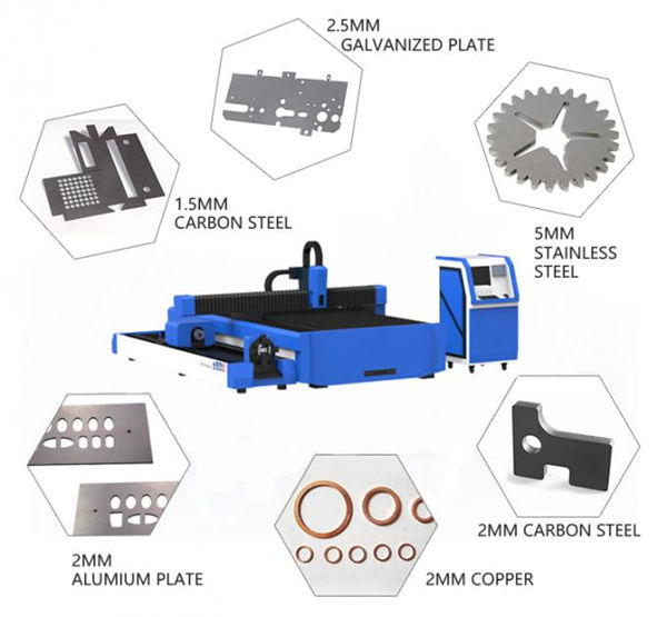 * Специјално се користи за сечење 0,5-6мм јаглероден челик, 0,5-5 мм не'рѓосувачки челик, галванизиран челик, електролитски цинк обложен со челичен лим, силиконски челик и други видови тенки метални лимови.1000W може да пресече 3мм алуминиум и 2мм бакар.